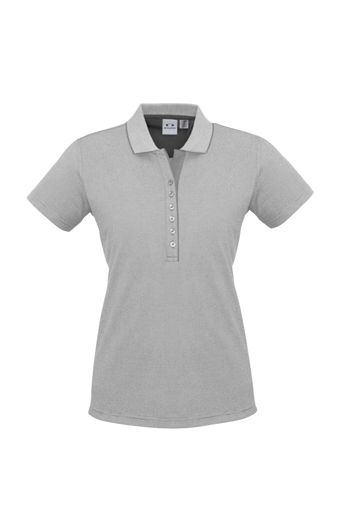 Sizes: 8 – 24; Fabric: Cotton Rich 54% Cotton, 23% Viscose, 23% Polyester,175 GSM,UPF rating – Excellent; Features: Soft-feel, cross-dyed tonal fine stripe pattern,Fashionable Y-line button placket,Sleek knitted flat jacquard collar;